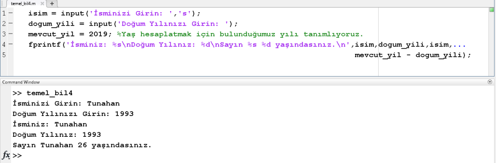 1 2 3 4 isim = input('İsminizi Girin: ','s'); dogum_yili = input('Doğum Yılınızı Girin: '); mevcut_yil = 2019; %Yaş hesaplatmak için bulunduğumuz yılı tanımlıyoruz. fprintf('İsminiz: %s\nDoğum Yılınız: %d\nSayın %s %d yaşındasınız.\n',isim,dogum_yili,isim,mevcut_yil-dogum_yili);