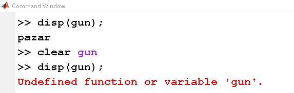 İki değişkenin değerlerini, birbirleriyle değiştirmek istiyorsanız “deal()” komutunu kullanabilirsiniz. Örnek kullanım: [a,b] = deal(b,a) Tanımladığımız bir değişkeni silmek istiyorsak “clear” komutunu kullanırız.