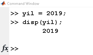 şeklinde yapılır. Örnek olarak, “yil” isimli bir değişken tanımlayalım ve ona “2019” değerini atayalım. Sonrasında, “disp()” komutu ile ekrana yazdıralım.