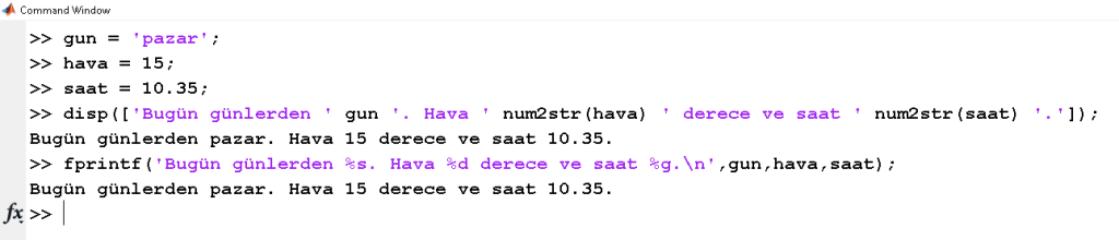 Birinci yazımızda “disp()” ve “fprintf()” komutlarından bahsetmiştik. Eğer ekrana bir sözel ifade ile bir sayısal değer yazdırılmak istenirse bu iki komut arasında farklılıklar bulunmaktadır. Bunu bir örnek ile açıklayalım. Ekrana, “Bugün günlerden pazar. Hava 15 derece ve saat 10.35 .” yazısını yazdıralım. “pazar”, “15” ve “10.35” bilgileri; “gun”, “hava” ve “saat” isimli değişkenlerden gelsin.