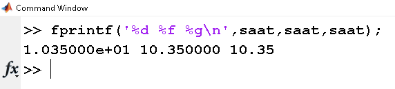 fprintf('Bugün günlerden %s. Hava %d derece ve saat %g.\n',gun,hava,saat);