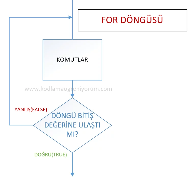 “for” döngüsünde tekrarlama sayısını kendimiz belirleriz. “for” döngüsü, kendimizin belirlediği sayıda tekrarlı işlem yapmamızı sağlar. Ancak “for” döngüsünün bize yardımcı olduğu çok daha önemli bir özelliği vardır. “for” döngüsü bize bir dizinin elemanları arasında dolaşmamız konusunda büyük kolaylıklar sağlar. Döngünün akış diyagramı(üstüne tıklayarak açabilirsiniz):