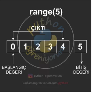 “range()” fonksiyonu, başlangıç ve bitiş değerini belirleyebildiğimiz bir liste oluşturur. Kullanımı: