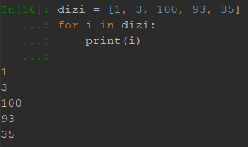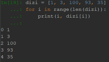 Dizinin eleman sayısı değişiyorsa veya kesin olarak bilinmiyorsa “len()” fonksiyonundan faydalanabiliriz. “len()” fonksiyonu bir nesnedeki eleman sayısını verir.