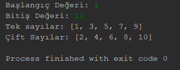 Bir örnek ile yazımızı sonlandıralım. Örneğimiz; kullanıcının belirlediği aralıktaki tek ve çift sayıları bulup, onları iki ayrı listede saklayan bir program olsun. Örneğimizde “%” işlevinden yararlanacağız. “%” işlevi, bölme işleminden kalan sayısı verir. Kodlamaya geçelim: