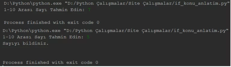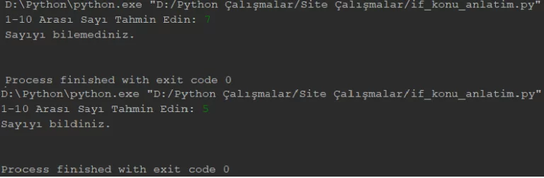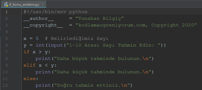 Özetleyecek olursak, kendimizin belirlediği sayı ile kullanıcının girdiği sayı aynıysa (x == y) “True” değeri üretilecek ve ekrana yazı yazdırılacak. Kodlama kısmına geçelim: