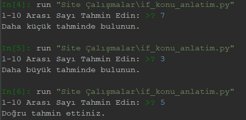 Kullanıcı, belirlediğimiz sayıdan daha küçük tahminde bulunursa ekranda “Daha büyük tahminde bulunun.”, daha büyük tahminde bulunursa ekranda “Daha küçük tahminde bulunun.” veya sayıyı bilirse de ekranda “Doğru tahmin ettiniz.” yazısı çıksın. Kodu güncelleyelim: