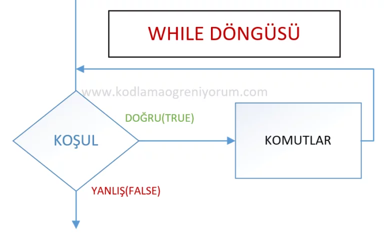 “while” döngüsü için bir koşul tanımlanır. Bu koşulun değeri “True“(Doğru) olduğu sürece döngü sürekli tekrarlanır. Bu nedenle “while” döngüsüne sonsuz döngü de denilir. Döngünün akış diyagramı(üstüne tıklayarak açabilirsiniz):