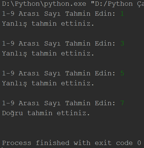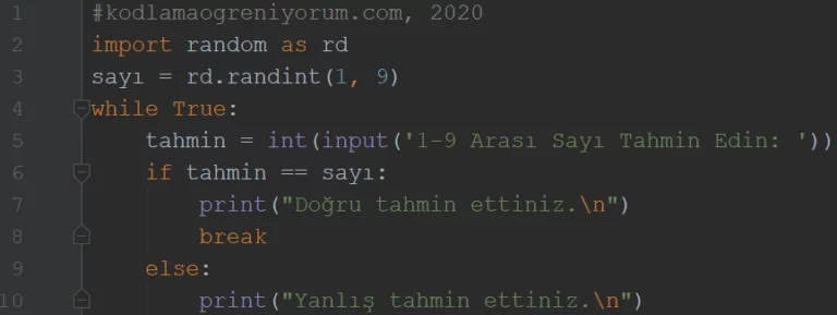 Sayımızı rastgele oluşturmak için “random” kütüphanesine ihtiyacımız var. “randint(1, 9)” komutu ile “randint()” fonksiyonunun ile 1 ile 9 arasında rastgele bir tam sayı üretmesini sağladık. “while” döngümüzün koşuluna “True” yazarak direkt döngünün aktif olmasını sağladık. Kullanıcının tahminini döngü içine alarak, kullanıcının yanlış bir tahminde bulunması durumunda tekrar tahmin etme şansını vermiş olduk.